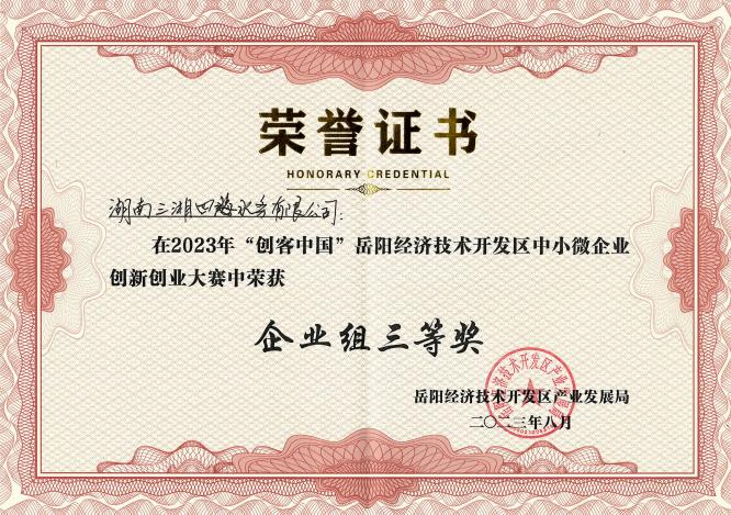 8月18日,2023年“創(chuàng )客中國”岳陽(yáng)經(jīng)開(kāi)區中小微企業(yè)創(chuàng )新創(chuàng )業(yè)大賽在岳陽(yáng)華瑞丹楓建國飯店舉行,湖南三湘四海水務(wù)有限公司“智慧加藥系統”項目獲得企業(yè)組三等獎。